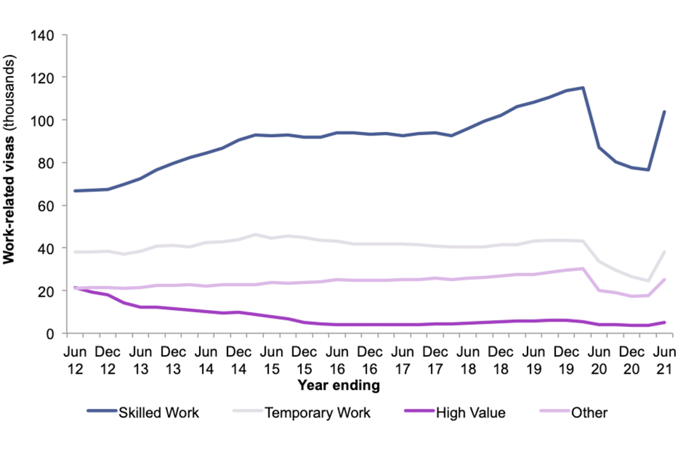A sharp rise in all visa types is seen in the year ending June 2021. Figure 1 shows the trend for each visa type and the fall in the number of grants for each of the main work-related visa types in the first two quarters of 2020, following the onset of the global pandemic.
