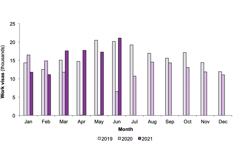 Figure 2 shows how the numbers of work visas have changed over the last 30 months, including over the course of the global pandemic. There were almost no work visas granted in April and May 2020, immediately following the onset of the COVID-19 pandemic. In the following months, grants started to recover but remained lower than the previous year until March 2021, where the number of work visas granted was higher than both March 2020 and March 2019. June 2021 grants were also higher than the previous two years, suggesting a sustained return to pre-pandemic levels in the latest data.