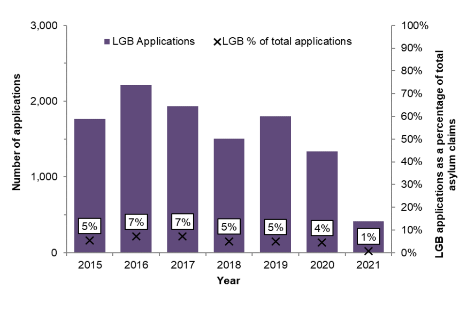 There were 415 asylum applications lodged in the UK in 2021, where sexual orientation formed part of the basis for the claim (LGB asylum applications), representing 1% of all asylum applications. This was 77% fewer than 2019. In contrast, total asylum applications increased (by 36%) between 2019 and 2021.