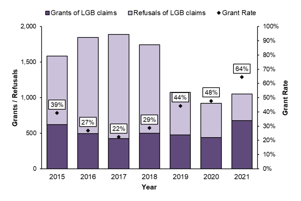 Previously, the grant rate for LGB asylum applications had been substantially lower than the grant rate for non-LGB asylum applications. However, this gap has been closer in recent years, with the LGB asylum application grant rate (64%) being only slightly lower than the non-LGB asylum applications grant rate (73%) in 2021.