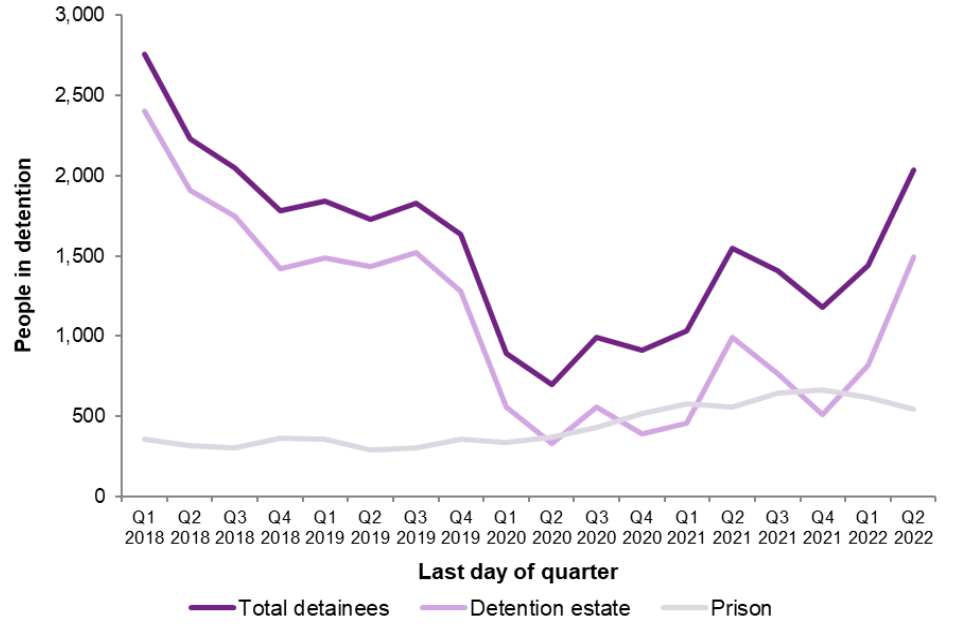 At the end of June 2022, there were 2,038 people in immigration detention (including those detained under immigration powers in prison), close to three times more than at the end of June 2020 (698) when the impact of the pandemic was most pronounced and 24% more than pre-pandemic levels at the end of December 2019 (1,637).