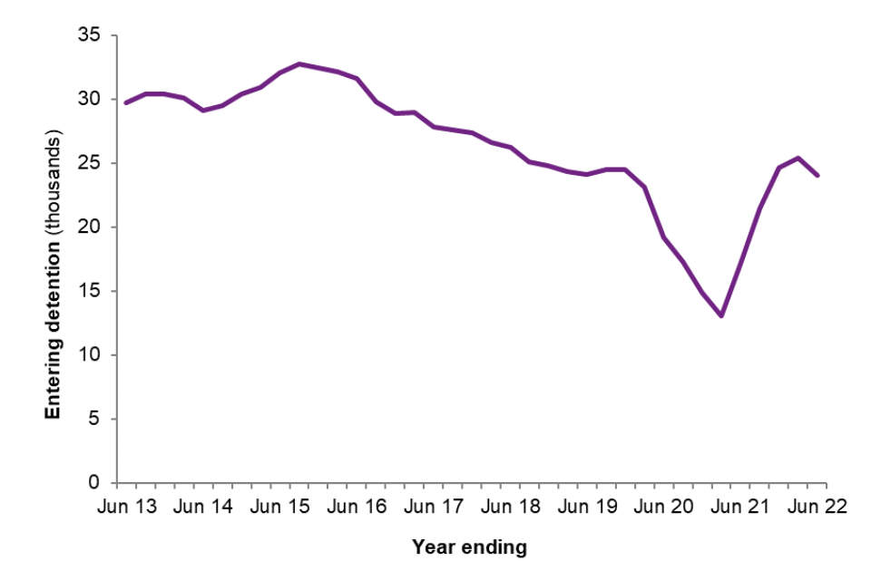 Figure 1: People entering immigration detention in the UK, year ending June 2013 to year ending June 2022