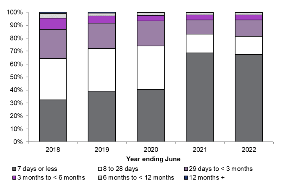 Figure 3: People leaving immigration detention, by length of detention1, year ending June 2018 to year ending June 2022