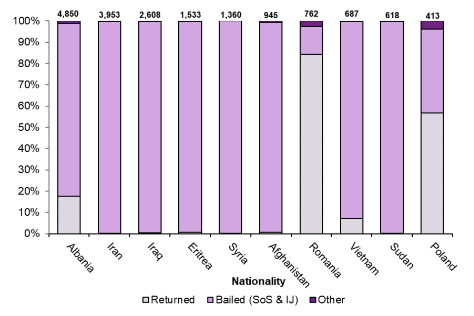 Figure 4 shows that among the top 10 nationalities leaving detention in the year ending June 2022, in most cases the individual was bailed. Of the top 10, only Albanian, Romanian and Polish nationals saw notable numbers returned to their country of origin.