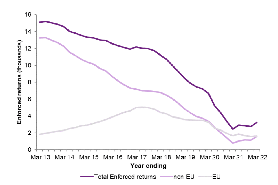 In the year ending March 2022, there were 3,231 enforced returns, 55% fewer than in 2019 pre-pandemic (7,198). The vast majority of enforced returns in the latest year were of Foreign National Offenders (FNOs) and 51% were EU nationals.