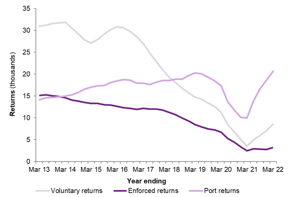 There were 20,601 passengers who were refused entry at port and subsequently departed (‘port returns’) in the year ending March 2022. The number of port returns fell substantially in Q2 2020 as very few passengers arrived in the UK immediately following the outbreak of the COVID-19 pandemic. The number of port returns has increased as more passengers began to arrive to the UK, with this type of return now 12% higher compared with 2019 (18,464).