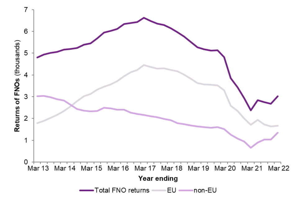 In the year ending March 2022, there were 3,025 FNOs returned from the UK, of which 55% were EU nationals (1,673) and 45% were non-EU nationals (1,352). FNO figures are a subset of the total returns figures and in the year ending March 2022 constituted the vast majority of enforced returns and 26% of enforced and voluntary returns combined.