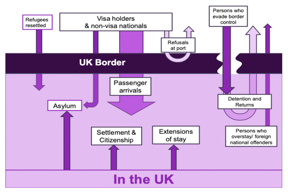 - A person can cross the UK Border legally either with a visa or as a non-visa national, as regular passenger arrivals, along with those that are seeking asylum and refugees through resettlement schemes. Individuals arriving at the border may be refused entry and returned to where they travelled from. Whilst in the UK, individuals may apply: for asylum; to extend their stay; to settle permanently; or for citizenship. Individuals also enter illegally by evading border control. Where detected, these individuals would be detained and returned. Individuals can also be removed from the UK for breaching their conditions of entry (e.g. persons who overstay) and foreign national offenders.