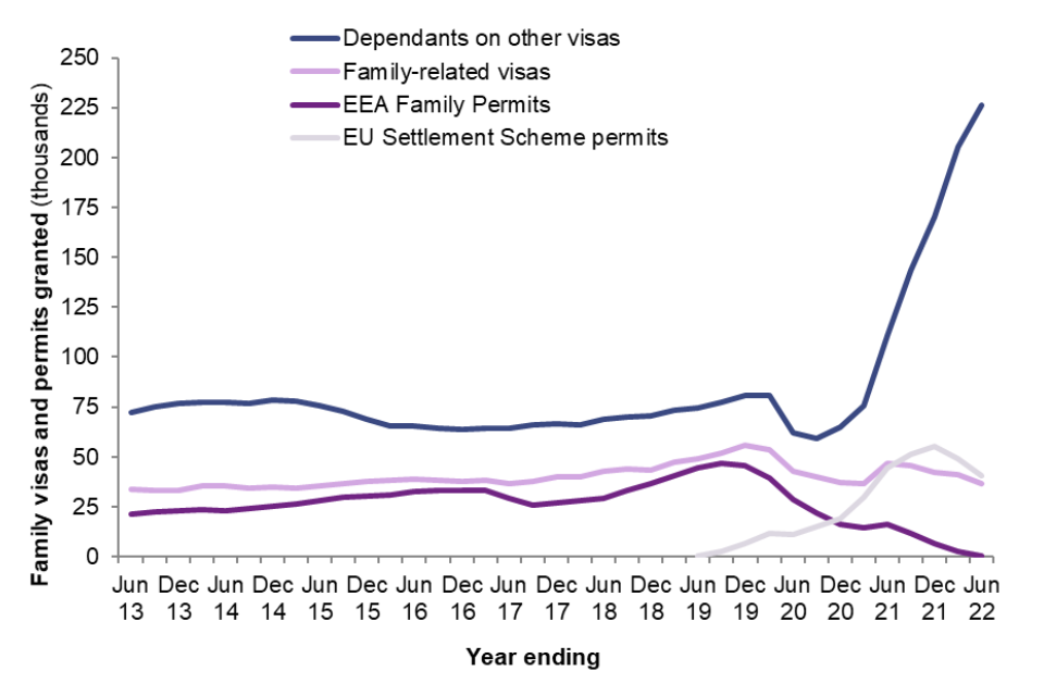 There were 303,553 visas and permits granted for all family reasons in the year ending June 2022, 61% more than 2019, largely due to increases in dependants of people coming on work or study visas, and the dependants of the newly introduced British Nationals (Overseas) route. The ‘Family’-related visas however are around one third fewer than the pre-pandemic period.