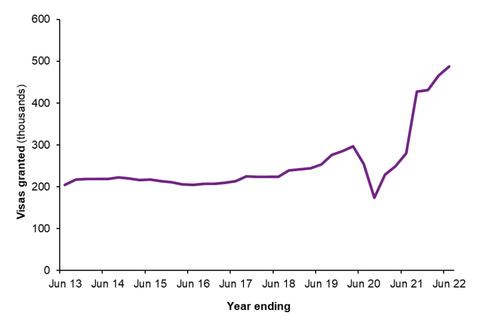 In the year ending June 2022, there were 486,868 Sponsored study visas granted (including dependants), 71% more than in 2019, the last full year before the pandemic.