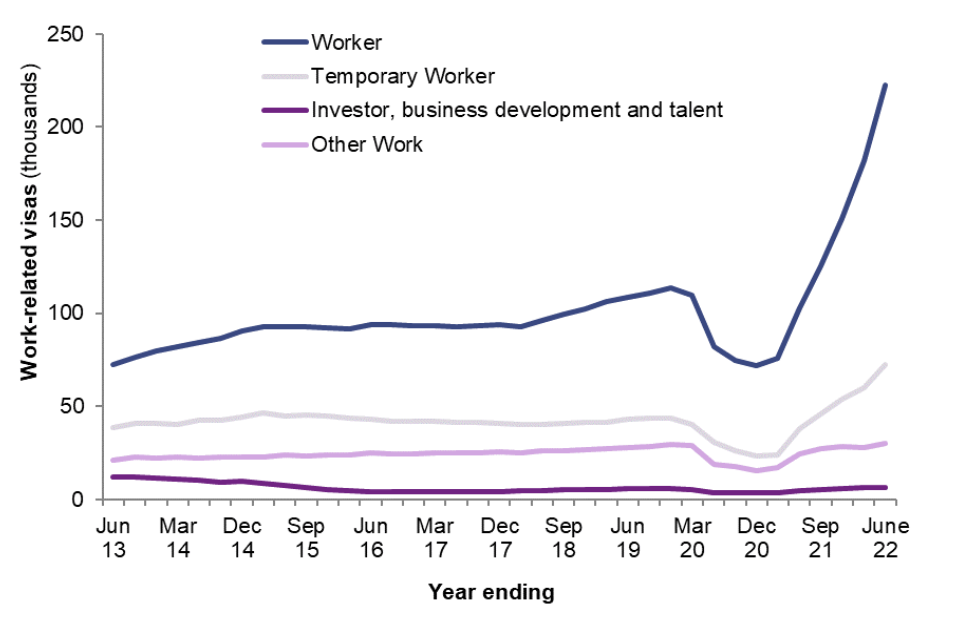 There were 331,233 work-related visas granted in the year ending June 2022 (including dependants). This was 72% more than in 2019, the last full year prior to the pandemic.