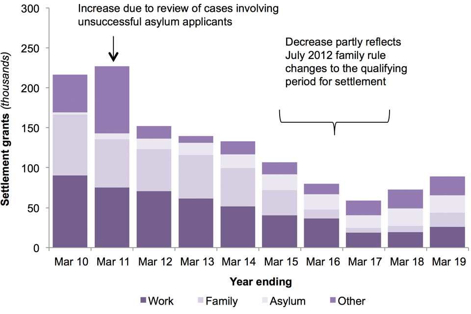 There were 92,636 decisions on applications for settlement in the UK in the year ending March 2019, 21% more than in the previous year. Of these, 89,146 (96%) resulted in a grant. There were increases in settlement: