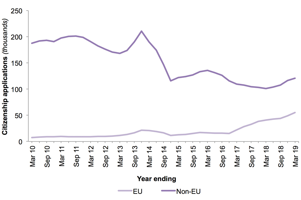 Applications made by non-EU nationals increased by 19% in the most recent year to 120,590, following falls in the previous 2 years. There was a doubling in applications for citizenship from Jamaican nationals (up 2,618 to 4,667), mainly due to applications made through the Windrush scheme (see ‘The Windrush Scheme’ for details on Windrush).