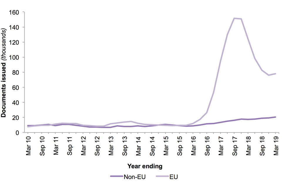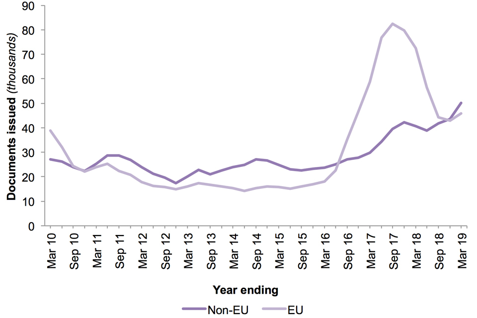 There were 37% fewer registration certificates issued to EU nationals (down 26,777 to 45,812), while documents issued to non-EU nationals increased by 23% (up 9,412 to 50,088).