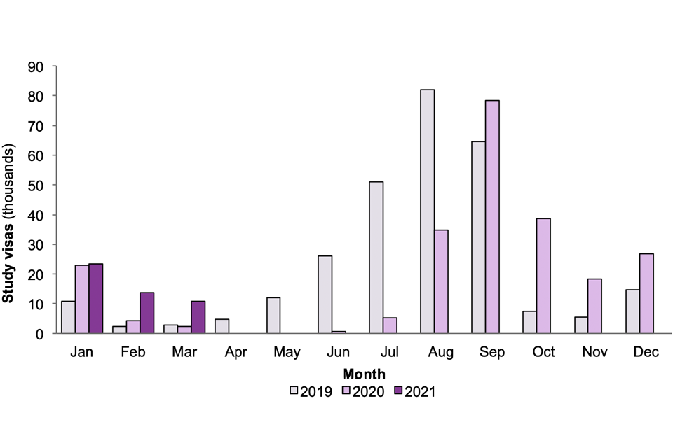Figure 1: Number of Tier 4 (Sponsored study) visas granted, by month, 2019, 2020 and 2021