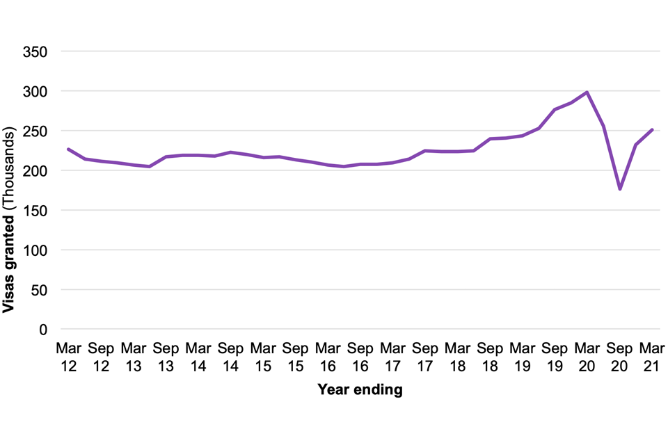 Sponsored study grants maintained broadly consistent around 225,000 from the YE March 2012 to the YE September 2018. From the YE September 2018 to the YE March 2020 sponsored study grants increased to a high of almost 300,000. This was followed by a sharp decrease due to COVID-19, with the YE September 2020 showing the lowest number of sponsored study grants on record. Grants proceeded to recover after this period, and now sit at just over 250,000 in the YE March 2021.