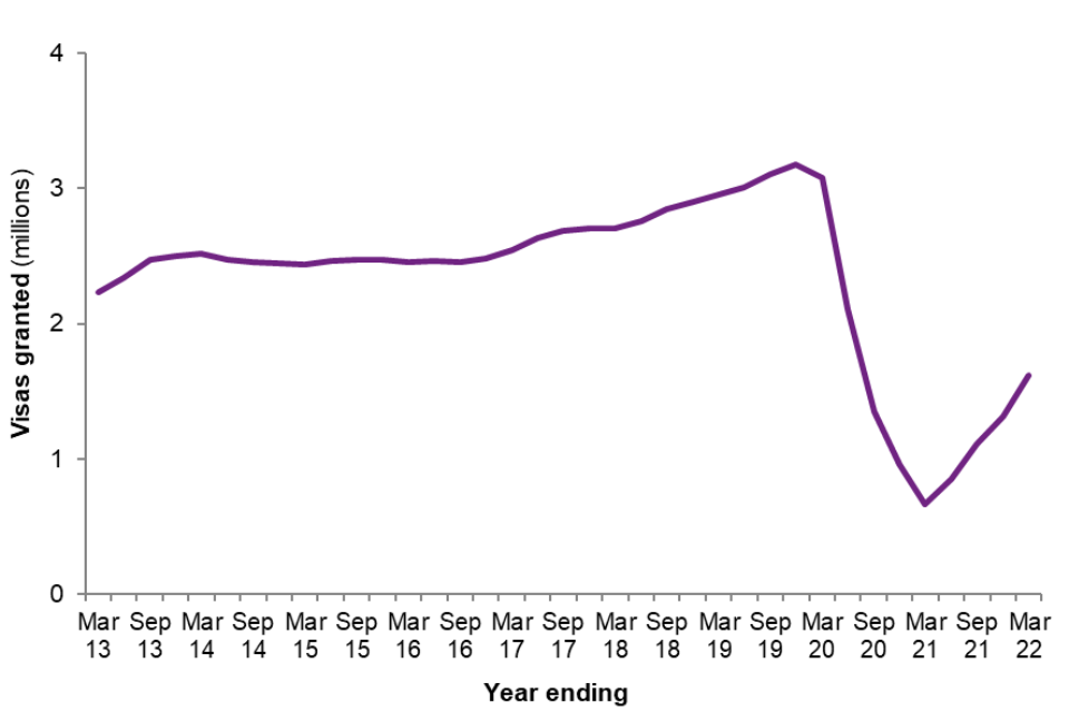 There was a modest recovery seen in the second quarter of 2021, with further increases in subsequent quarters. Grants of visitor visas in Q1 (January to March) 2022 (245,513) were the highest quarterly figure since before the pandemic, but still a third lower (-33%) of the 364,535 grants seen in Q1 2020. This suggests that visitor numbers are still significantly affected by the COVID pandemic.