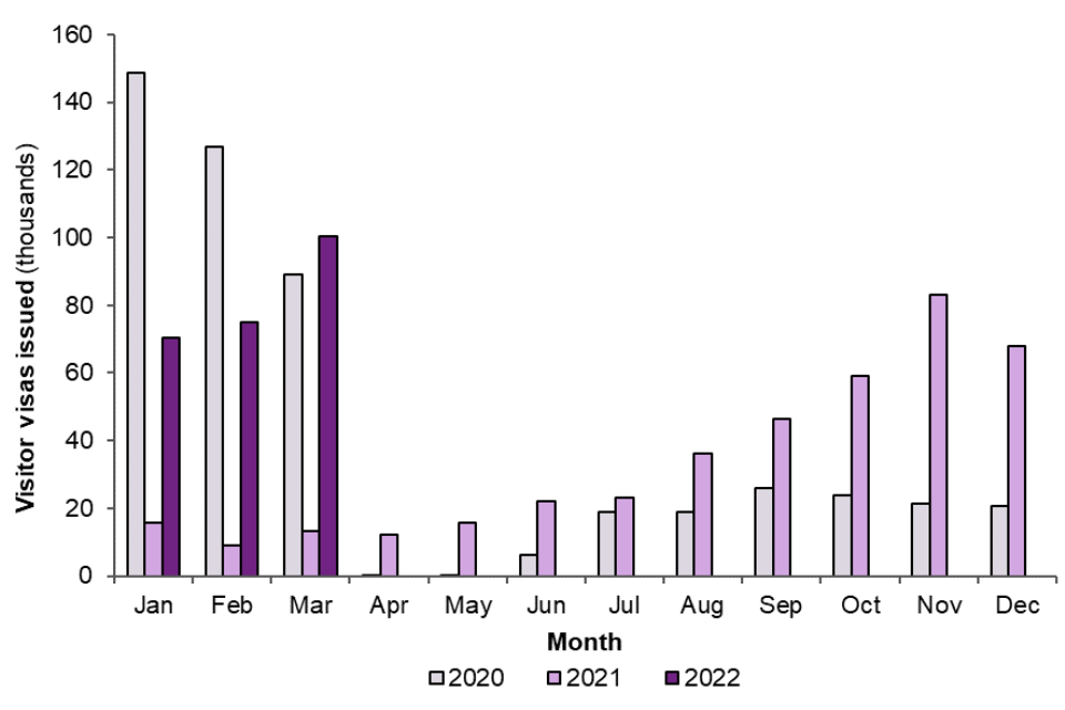 Figure 3: Visitor visas issued, by month, 2020, 2021 and 2022