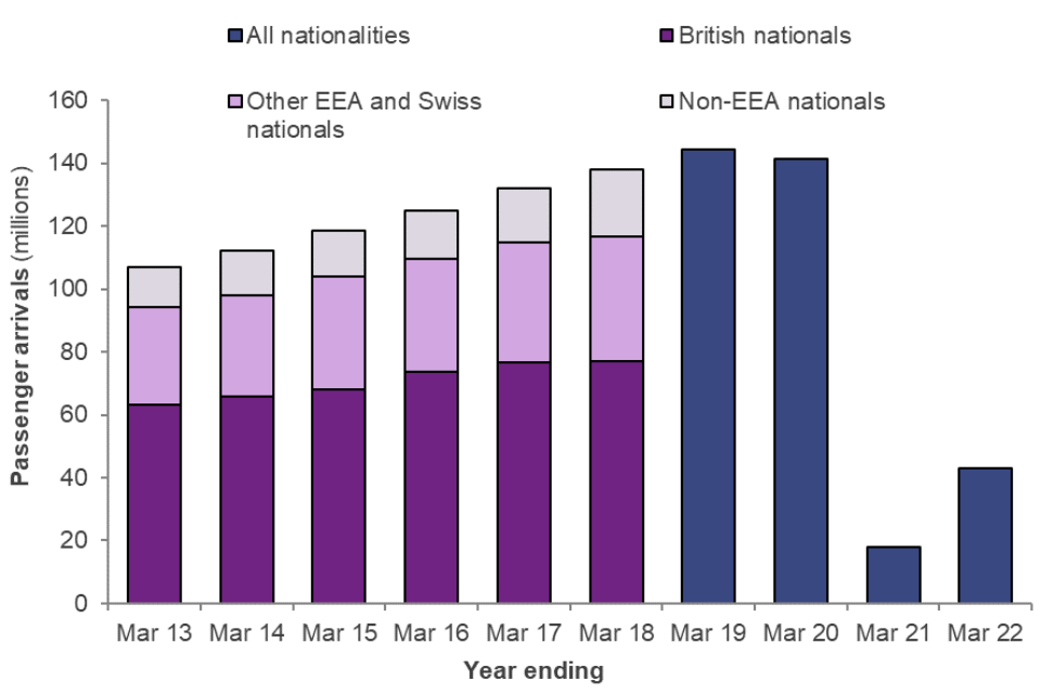 There were an estimated 42.9 million passenger arrivals in the year ending March 2022 (including returning UK residents), more than twice as many as in the year ending March 2021 (18.1 million) but less than a third of arrivals in the year ending March 2020 (141.2 million). The differences in the number of passenger arrivals are due to the travel restrictions imposed as a result of the COVID-19 pandemic.