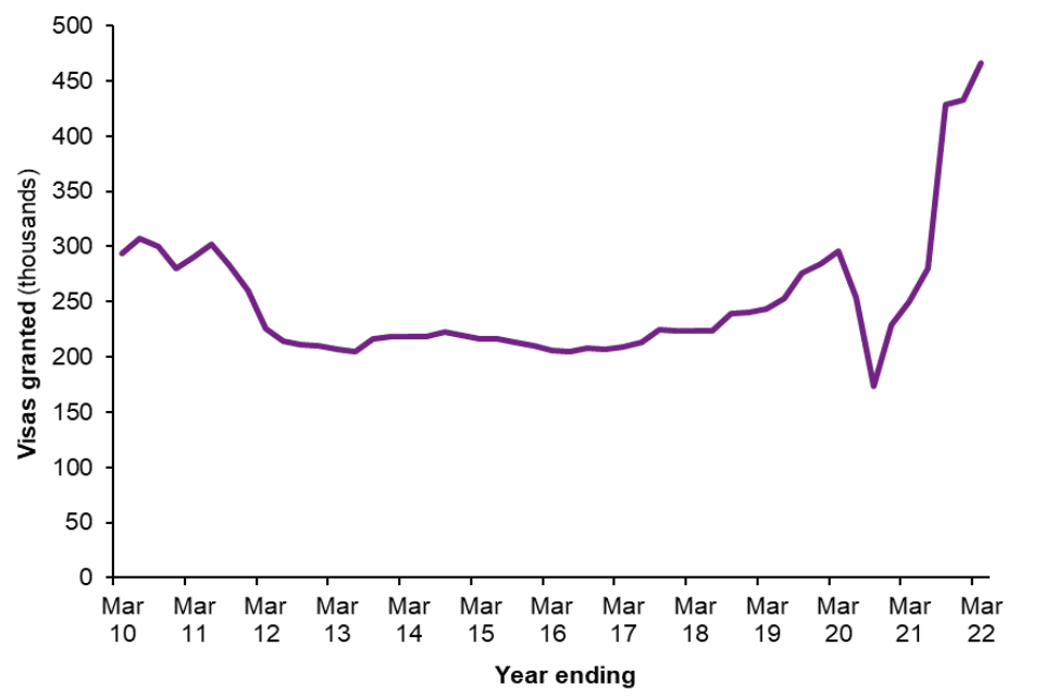 Figure 1: Sponsored study visa grants, year ending by quarter, March 2010 to March 2022