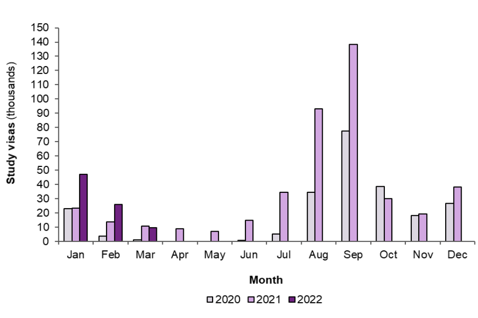 Figure 2: Number of Sponsored study visas granted, by month, 2020 - 2022
