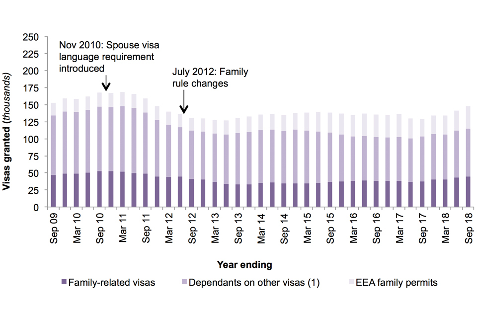 There were 147,865 visas granted for family reasons in the year ending September 2018, 14% more than in the previous year. This included: