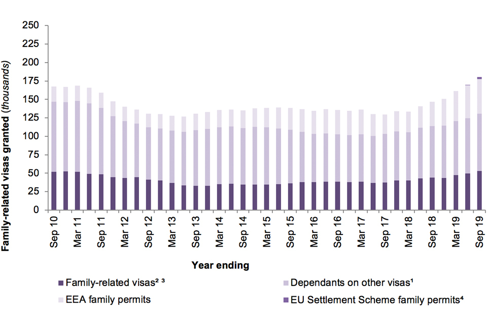 1. From December 2017, data on ‘Family-related visas granted’ to children include children of a parent given limited leave to enter or remain in the UK for a probationary period. These were previously included as ‘Dependants on other visas (excl. Visitor visas)’. The increase in grants to children in the year ending September 2019 reflects this change.