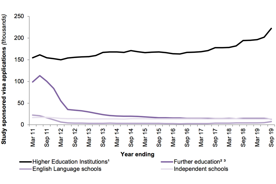 In the year ending September 2019, Sponsored study visa applications (main applicants only) rose 13% to 258,787. The majority (86%) of these were for study at higher education (university) institutions, whose number increased by 14% to 222,047, the highest level on record.