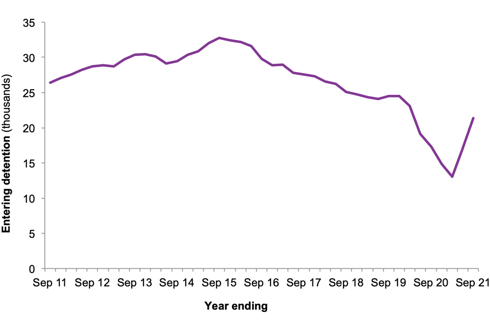 21,365 people entered immigration detention in the year ending September 2021, 24% higher than the previous year. However, this follows a large fall in the number of people entering detention following the COVID-19 outbreak and is just below pre-pandemic levels.