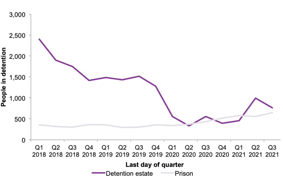 Data on immigration detention relates to year ending September 2021 and all comparisons are with year ending September 2020, unless indicated otherwise.