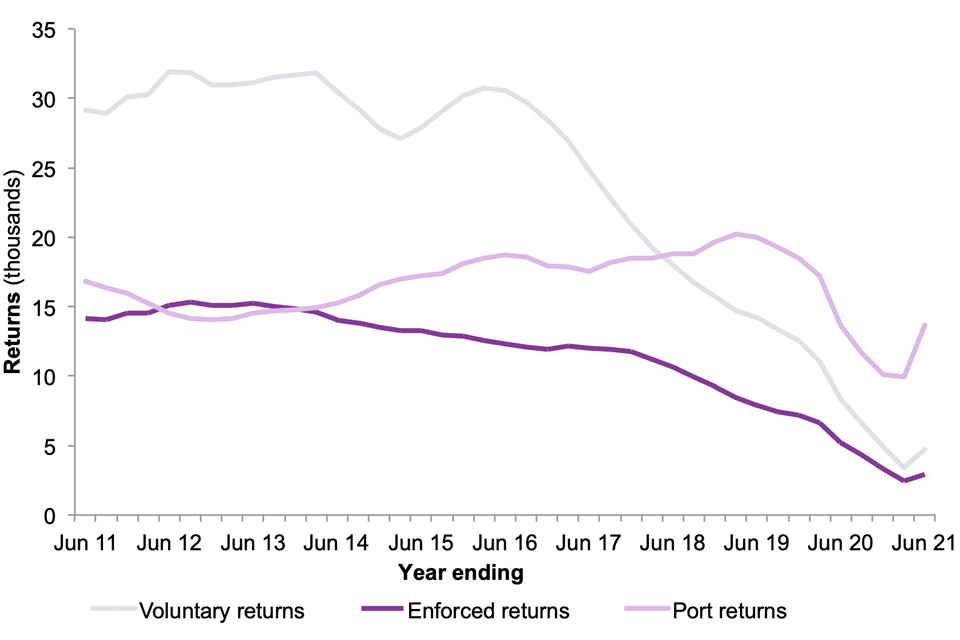 Figure 5: Returns from the UK, by type of return1, year ending June 2011 to year ending June 2021