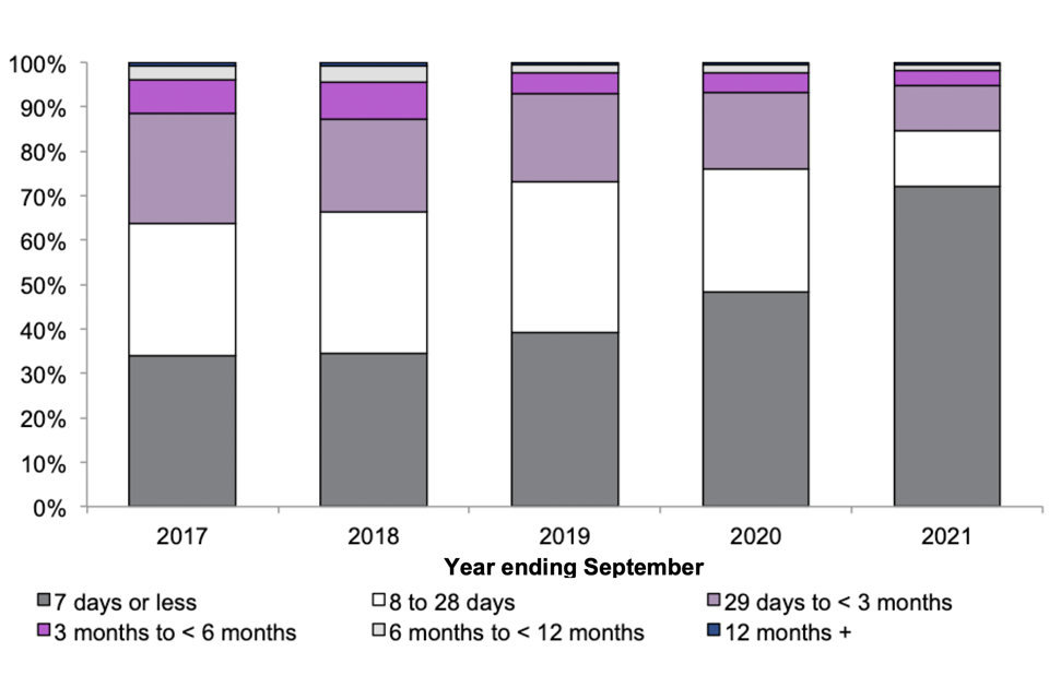 Figure 3: People leaving immigration detention, by length of detention1,2, year ending September 2017 to year ending September 2021