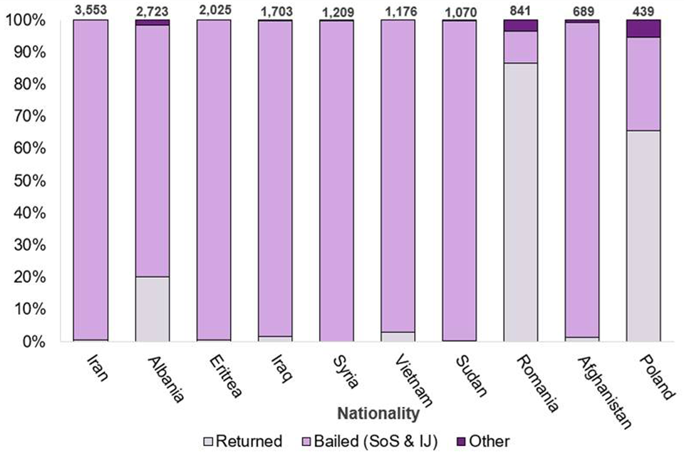Figure 4 shows that among the top 10 nationalities leaving detention in year ending September 2021 the majority were bailed, only Albanians, Romanians and Polish nationals had significant returns.