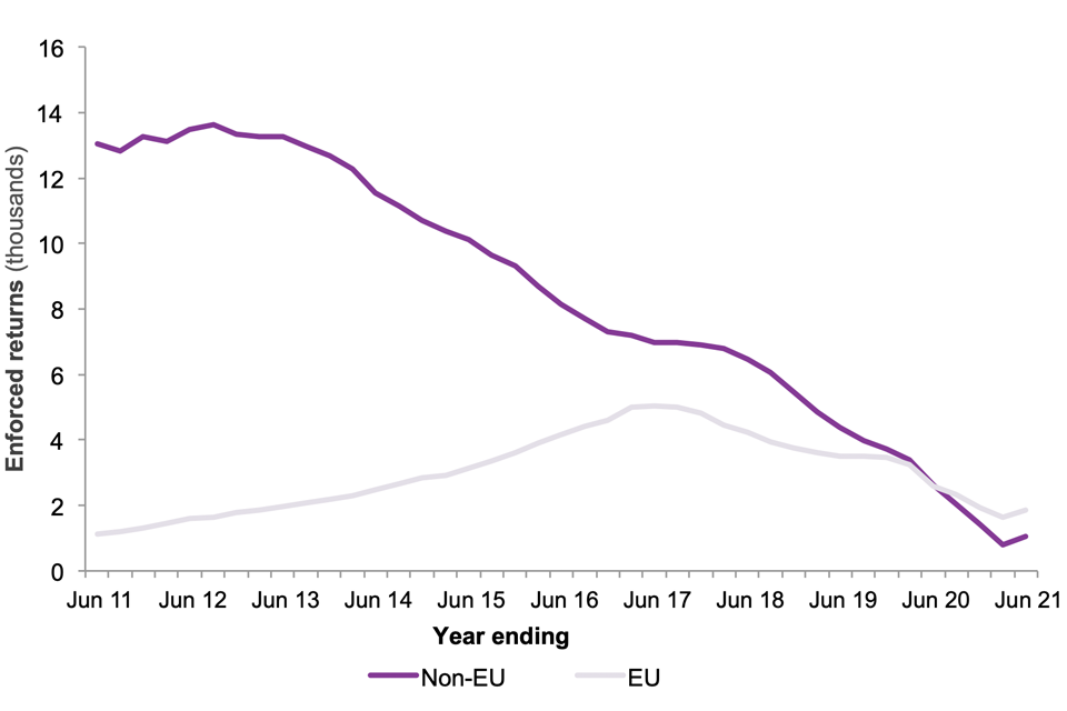 Figure 6: Enforced returns from the UK, for EU and non-EU nationals1, year ending June 2011 to year ending June 2021