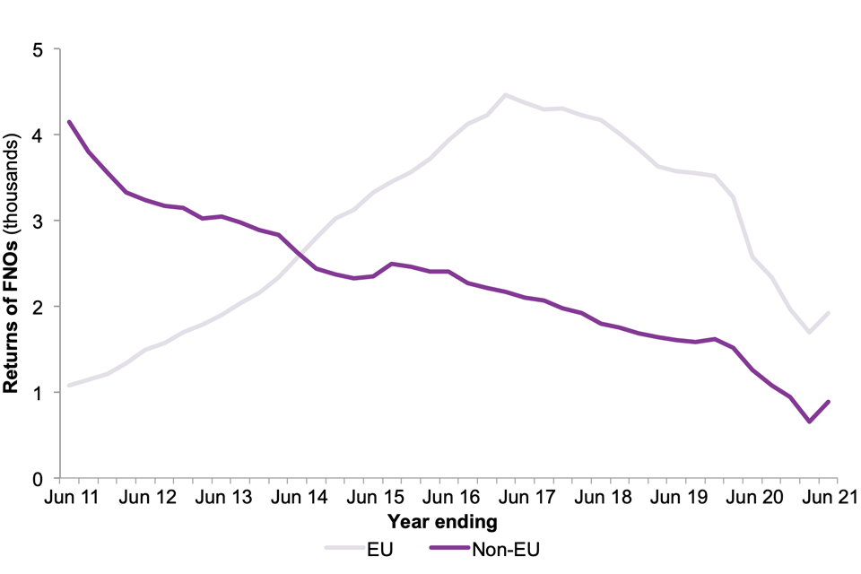Figure 7: Returns of FNOs1 from the UK, for EU and non-EU nationals, year ending June 2011 to year ending June 2021