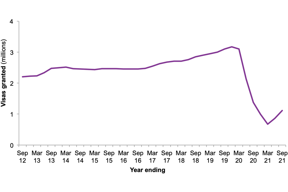 Figure 2 shows that the total number of visas granted had been broadly stable between 2013 and 2016 at around 2.5 million and then rose steadily to a peak of 3.2 million by 2019. The number then fell significantly due the COVID-19 pandemic, to below 1 million, but has seen a small recovery in the latest two quarters of 2021 as international restrictions have been lifting.