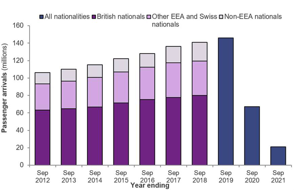There were an estimated 21 million passenger arrivals in the year ending September 2021 (including returning UK residents), over two thirds (69%) less than the previous year, due to the travel restrictions imposed as a result of the COVID-19 pandemic.