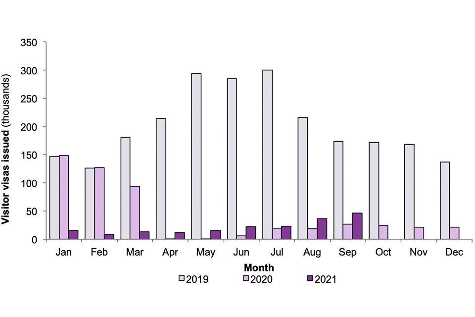 Figure 3: Visitor visas issued, by month, 2019, 2020 and 2021