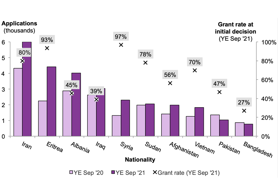 Iran was the top nationality claiming asylum in the UK in the year ending September 2021 (6,002 applications), as it has been in every year since 2016.