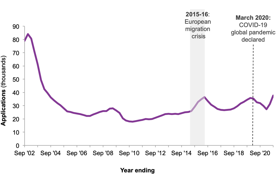 Figure 2: Asylum applications lodged in the UK, years ending September 2002 to September 20211