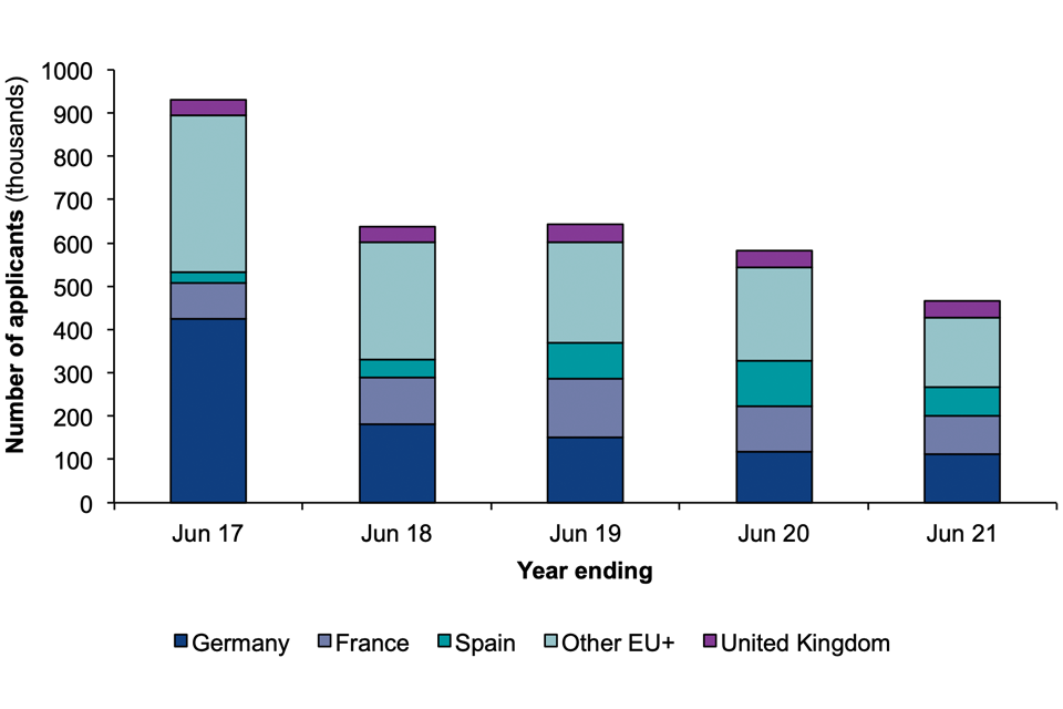 In the year ending June 2021 (the latest available comparable statistics), the fall in UK asylum applications was smaller than falls seen more widely across Europe. The number of people (including dependants) claiming asylum in the EU+ (countries in the EU, EEA and Switzerland) decreased by 21%, and in the UK decreased by 9%.