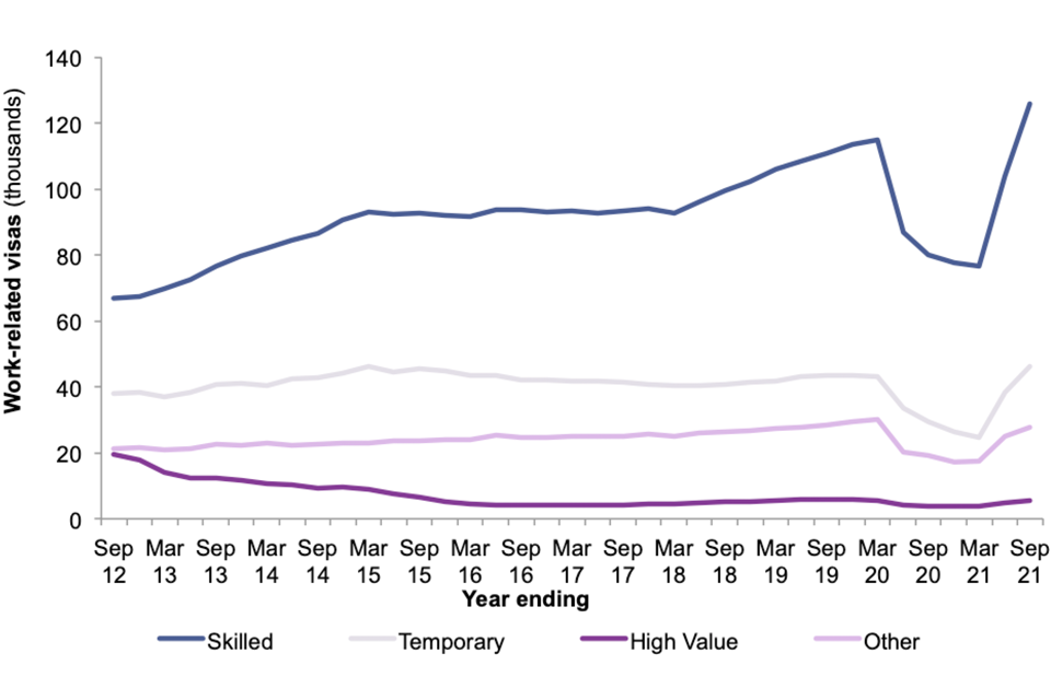 A sharp rise in all visa types is seen in the year ending September 2021. Figure 1 shows the trend for each visa type and the fall in the number of grants for each of the main work-related visa types in the first two quarters of 2020, following the onset of the global pandemic.