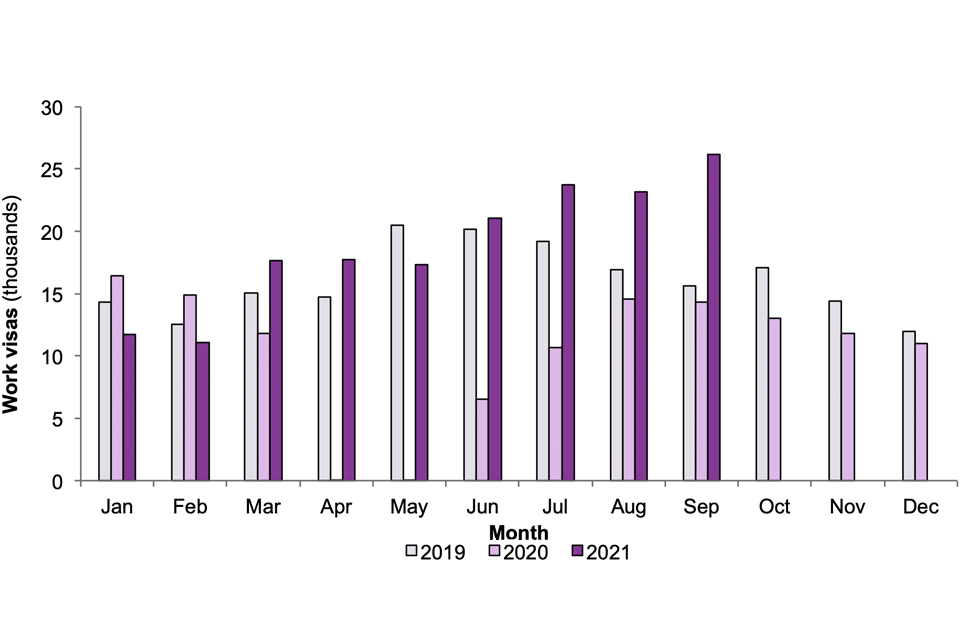Figure 2 shows how the number of work visas have changed over each month in the last three years, including over the course of the global pandemic. There were almost no work visas granted in April and May 2020, immediately following the onset of the COVID-19 pandemic. In the following months, grants started to recover but remained lower than the previous year until March 2021, where the number of work visas granted was higher than both March 2020 and March 2019. Grants from June to September 2021 were also higher than the previous two years, suggesting an increase beyond pre-pandemic levels in the latest data.