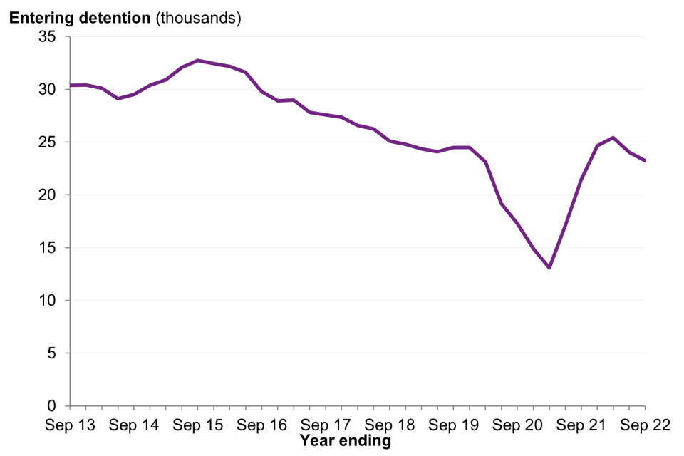 Figure 1: People entering immigration detention in the UK, year ending September 2013 to year ending September 2022