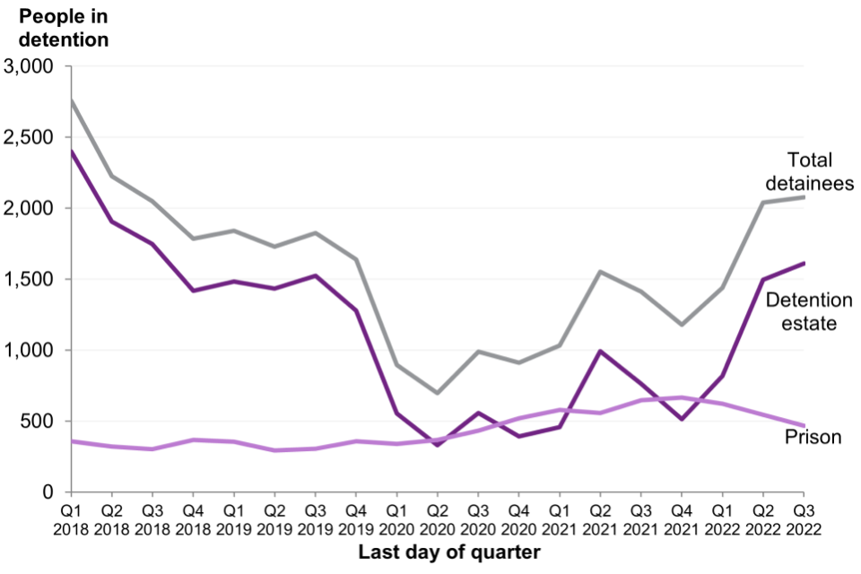 Figure 2 shows the number of people detained in the detention estate fell immediately following the pandemic but has now risen above pre-pandemic levels (1,610 at the end of September 2022 compared with 1,278 at the end of December 2019, before the pandemic), although was still lower than the number of people detained in the detention estate at the end of March 2018 (2,400).