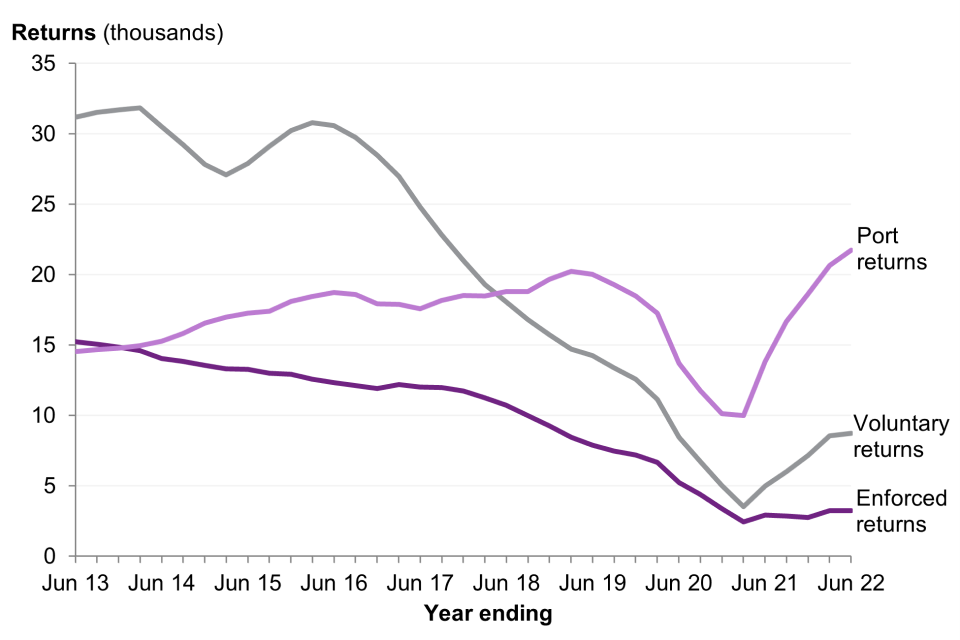 There were 21,725 passengers who were refused entry at port and subsequently departed (‘port returns’) in the year ending June 2022. The number of port returns fell substantially between April to September 2020 as very few passengers arrived in the UK immediately following the outbreak of the COVID-19 pandemic. The number of port returns has increased as more passengers began to arrive to the UK, with this type of return now 18% higher compared with 2019 (18,464).