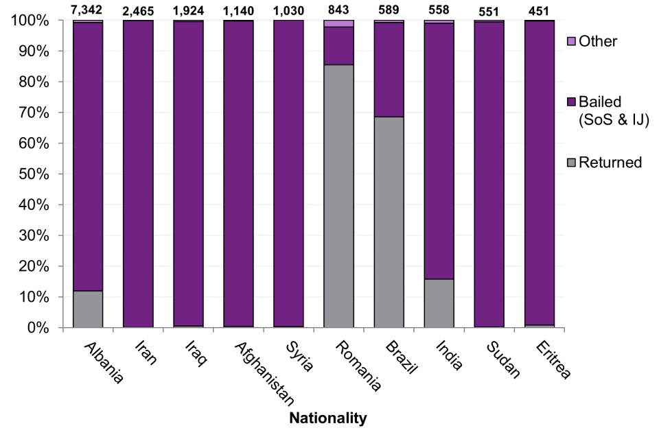 Figure 4 shows that among the top 10 nationalities leaving detention in the year ending September 2022, in most cases the individual was bailed. However, for Romanians (6th) and Brazilians (7th) the majority were returned, with a notable number of Albanians also returned (875), which will be the more common outcome for those individuals detained for criminality or overstaying reasons.