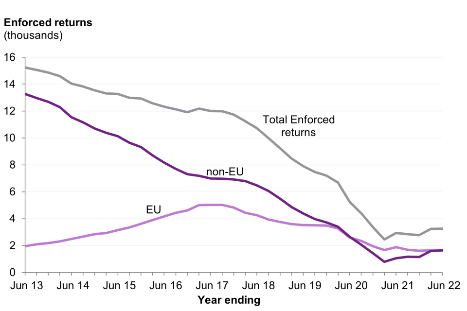 In the year ending June 2022, there were 3,250 enforced returns, 55% fewer than in 2019 pre-pandemic (7,198). The vast majority of enforced returns in the year ending June 2022 were of Foreign National Offenders (FNOs) and around a half (49%) were EU nationals.