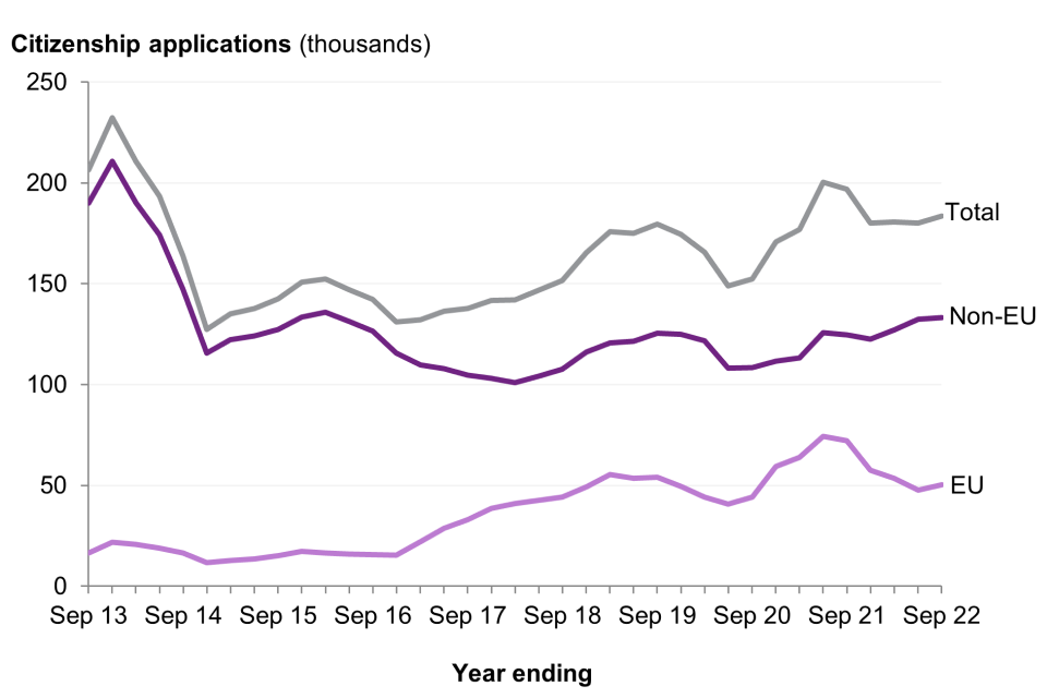 There were 183,414 applications for British citizenship in the year ending September 2022, 5% more than in 2019, the last year prior to the pandemic.