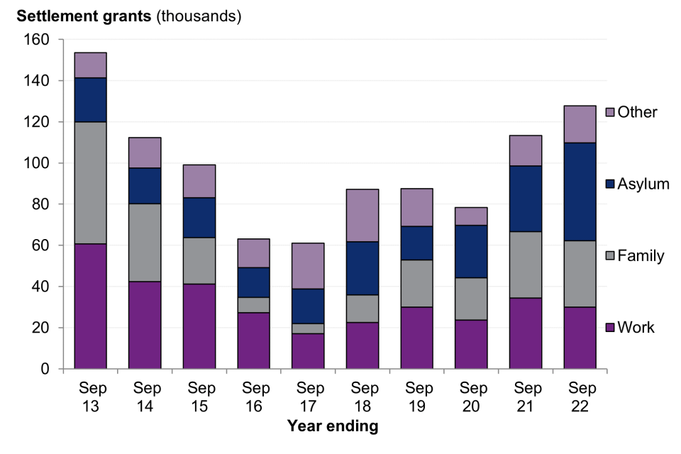 Figure 1 shows the number of settlement grants fell from 153,654 in the year ending September 2013 to 61,009 in the year ending September 2017 but have since risen again, reaching a total of 127,820 in the year ending September 2022.